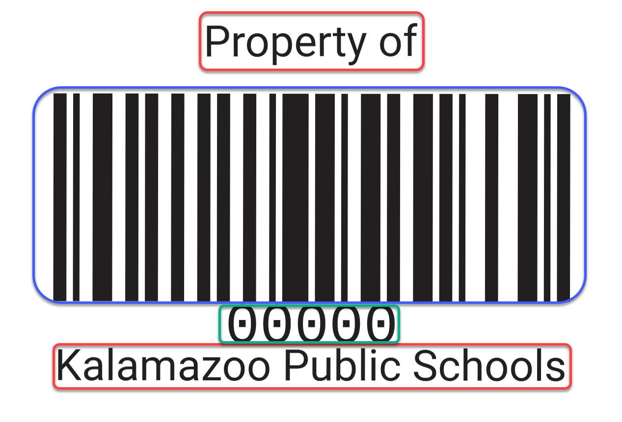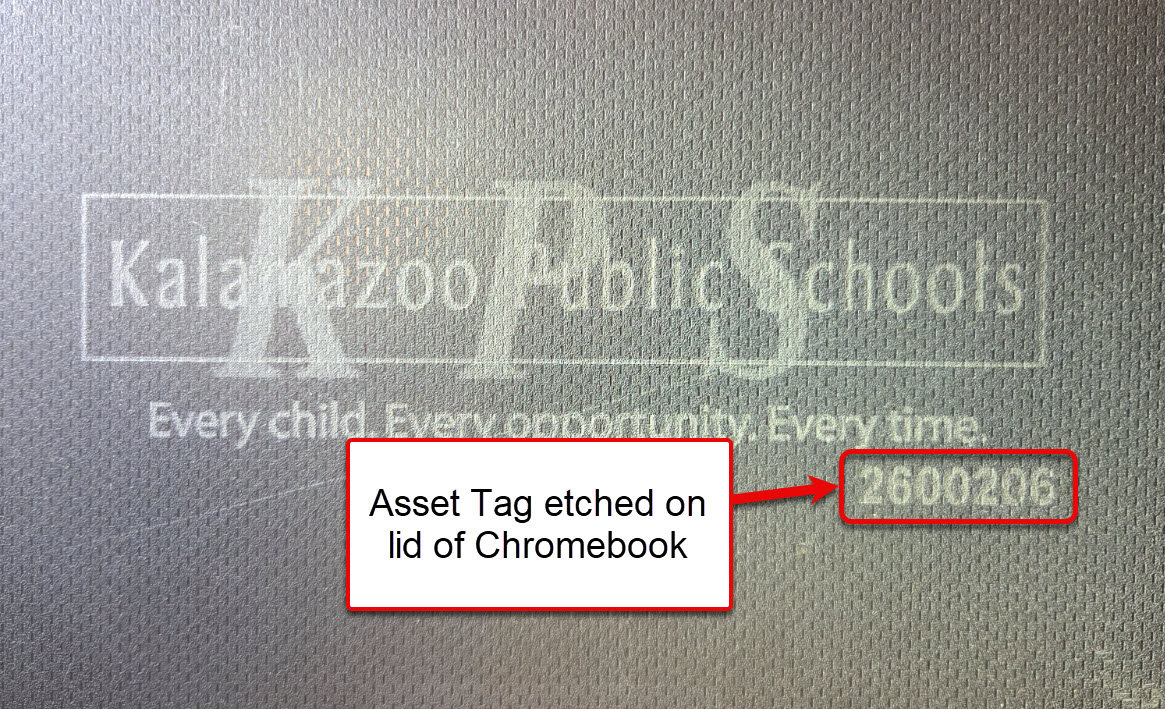An Asset Tag, (AT#), is a five or seven digit number that Technology Services uses to assist with tracking and managing technology at Kalamazoo Public Schools. From Chromebooks to projectors many varieties of technology will have an asset tag.