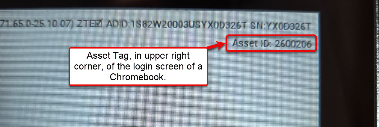 • With the Chromebook open and the device powered on you can find it at the login screen in the upper right corner. It will say "Asset Tag:" followed by the number.